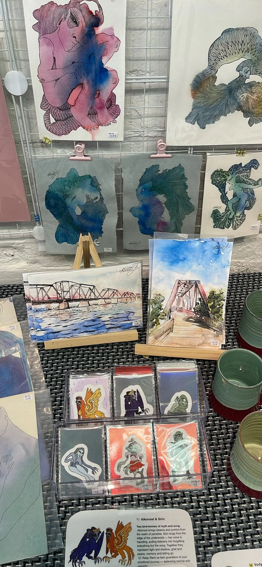 Original watercolors, small works, and artist-designed stickers — unique pieces under 500$ available for purchase.